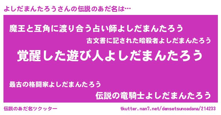 | 男性向けラノベタイトル風あだ名 | 『うちのよしだまんたろうが世界を掌握している!』 |