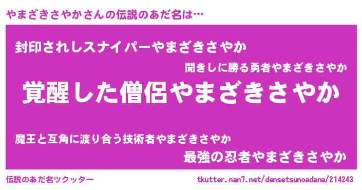 | 男性向けラノベタイトル風あだ名 | 『やまざきさやかの嫁は女の子じゃないと思った?』 |