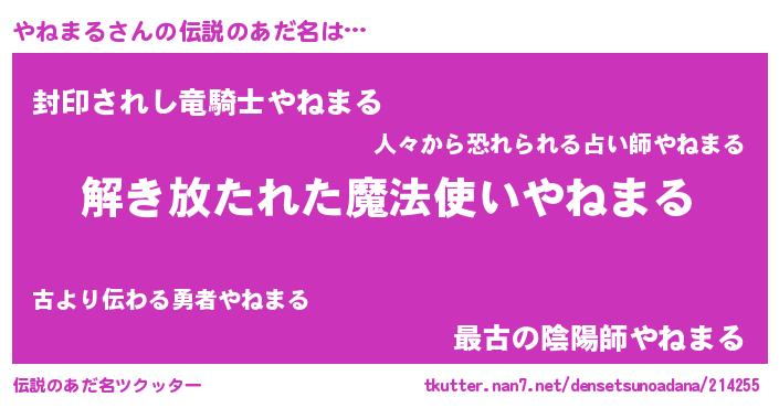 | 男性向けラノベタイトル風あだ名 | 『やねまるの嫁は女の子じゃないと思った?』 |