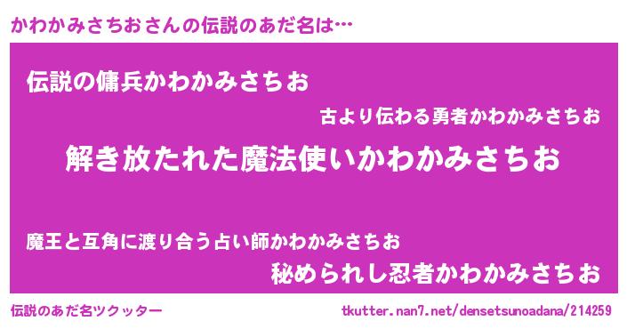 | 男性向けラノベタイトル風あだ名 | 『かわかみさちおの嫁は女の子じゃないと思った?』 |