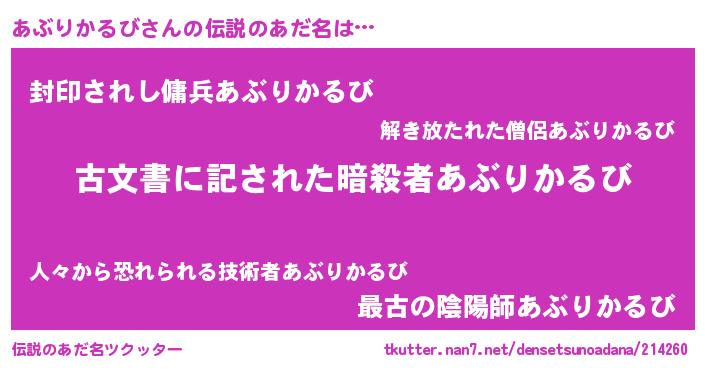 | ヘコむあだ名 | 『あぶりかるび(爆)』『あぶにゅー』 |