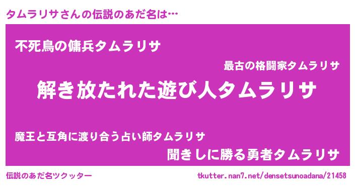 | 男性向けラノベタイトル風あだ名 | 『Re:タムラリサから始める異世界生活』 |