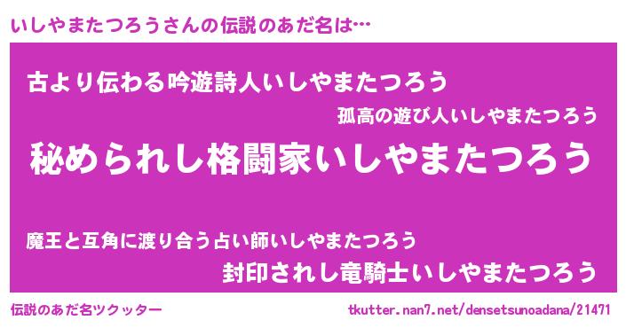 | 男性向けラノベタイトル風あだ名 | 『やはりいしやまたつろうの青春ラブコメはまちがっている 』 |