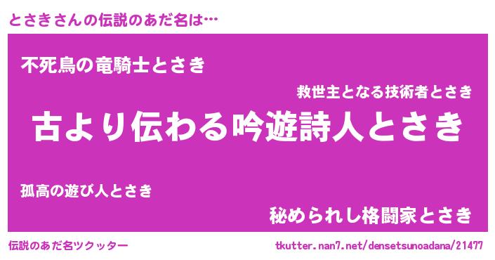 | 男性向けラノベタイトル風あだ名 | 『とさきという概念が存在しない退屈な世界 』 |