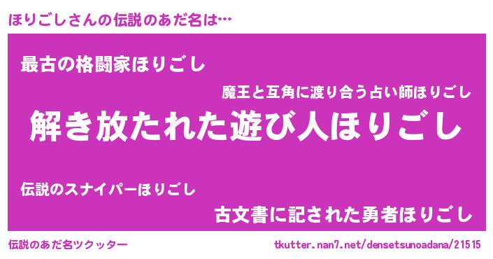 | 男性向けラノベタイトル風あだ名 | 『Re:ほりごしから始める異世界生活』 |
