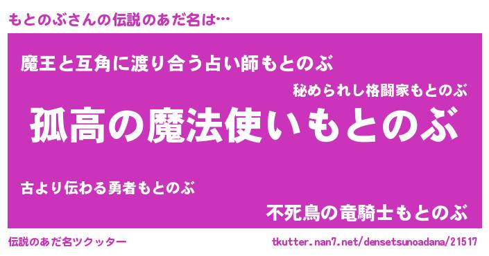 | 胡散臭い通販商品みたいなあだ名 | 『信頼と実績のサプリメント…その名も「もとのぶ」』 |