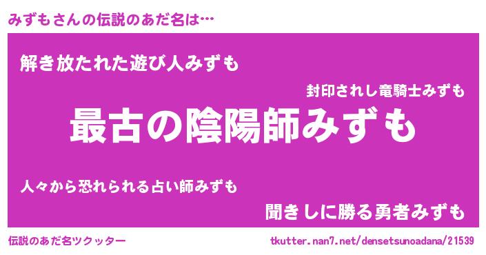 | 男性向けラノベタイトル風あだ名 | 『Re:みずもから始める異世界生活』 |