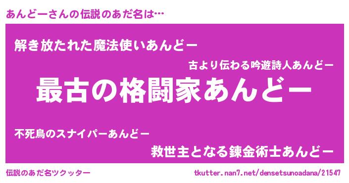 | 意味不明あだ名 | 『住所不定無職あんどー(1歳)』 |