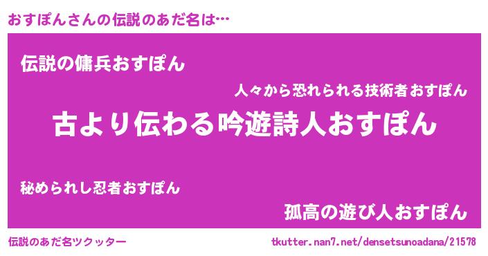 | 男性向けラノベタイトル風あだ名 | 『おすぽんに滅ぼされるだけの簡単なお仕事です』 |