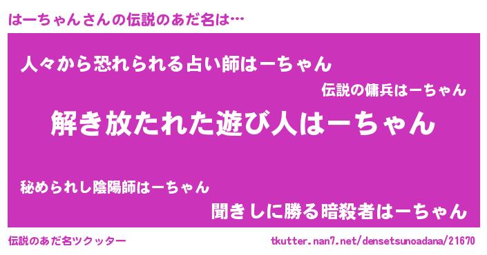 | ヒーロー風カッコイイあだ名 | 『銀牙騎士ハー』『慈愛の使者はーちゃん』 |