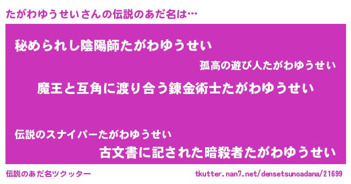 | 女子向けラノベタイトル風あだ名 | 『たがわゆうせい恋絵巻』 |