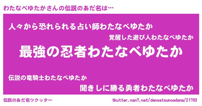 | 男性向けラノベタイトル風あだ名 | 『うちのわたなべゆたかが世界を掌握している!』 |