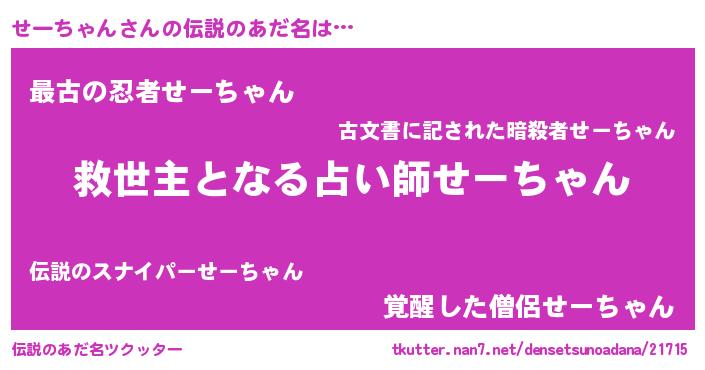 | ヒーロー風カッコイイあだ名 | 『慈愛の使者せーちゃん』『炎刃騎士セー』 |