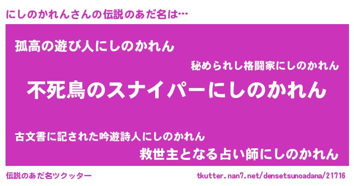 | 胡散臭い通販商品みたいなあだ名 | 『モテモテ間違いなし霊験あらたかなお札…その名も「にしのかれん」』 |