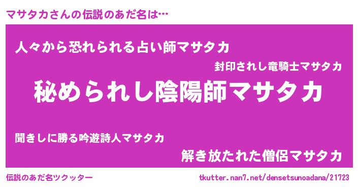 | 男性向けラノベタイトル風あだ名 | 『マサタカスレイヤー』『緋弾のマサタカ』 |