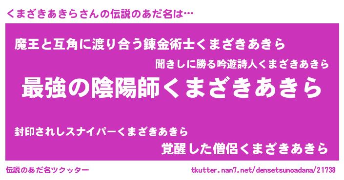 | ファンタジー風あだ名 | 『エターナルクマザキアキラー』 |