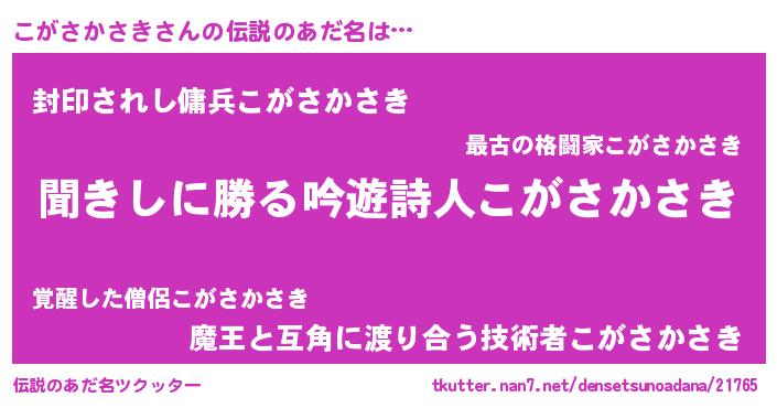 | 男性向けラノベタイトル風あだ名 | 『こがさかさきという概念が存在しない退屈な世界 』 |