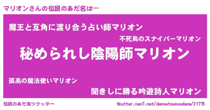 | 料理風あだ名 | 『マリオンごはん』『マリオンのトマト煮』 |