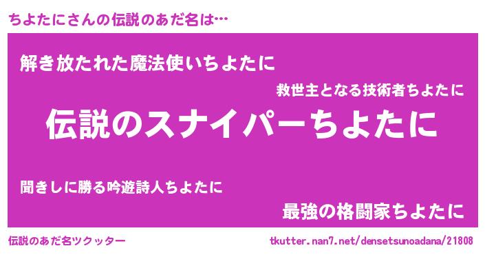 | 男性向けラノベタイトル風あだ名 | 『魔弾の王とちよたに』 |