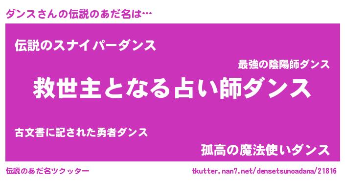 | 男性向けラノベタイトル風あだ名 | 『ダンスに滅ぼされるだけの簡単なお仕事です』 |