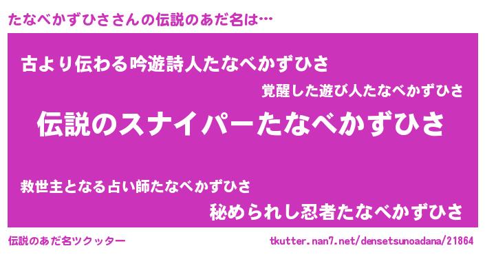 | 男性向けラノベタイトル風あだ名 | 『タナベカズヒサスレイヤー』 |