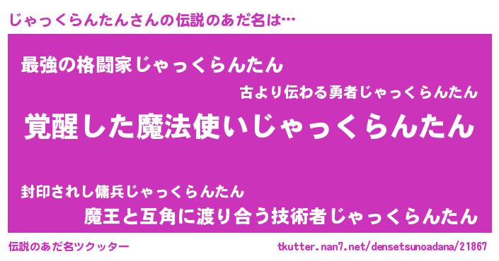 | 男性向けラノベタイトル風あだ名 | 『Re:じゃっくらんたんから始める異世界生活』 |