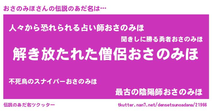 | 男性向けラノベタイトル風あだ名 | 『おさのみほの嫁は女の子じゃないと思った?』 |