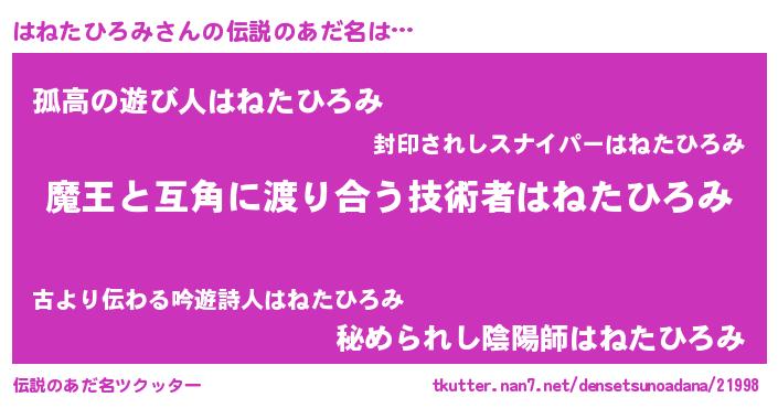 | ポケモン風あだ名 | 『ハックウザ』『ヒハネタヒロミ』 |