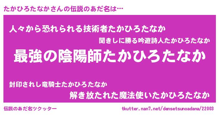 | 男性向けラノベタイトル風あだ名 | 『この素晴らしい世界にたかひろたなかを!』 |