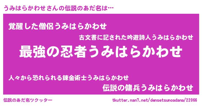 | 胡散臭い通販商品みたいなあだ名 | 『あなたにだけ特別に提供する限定10本のレアな日本酒…その名も「うみはらかわせ」』 |