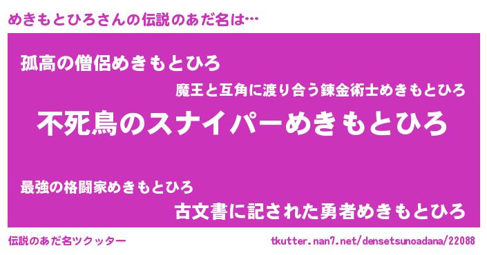 | 意味不明あだ名 | 『住所不定無職めきもとひろ(98歳)』 |