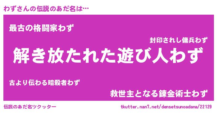 | 女子向けラノベタイトル風あだ名 | 『わずの卵を拾いまして』『わず恋絵巻』 |