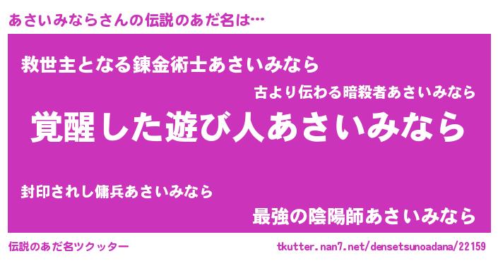 | 男性向けラノベタイトル風あだ名 | 『あさいみならに滅ぼされるだけの簡単なお仕事です』 |
