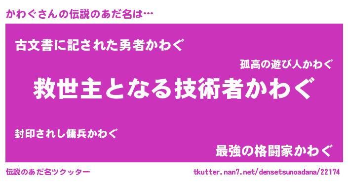 | 男性向けラノベタイトル風あだ名 | 『Re:かわぐから始める異世界生活』 |