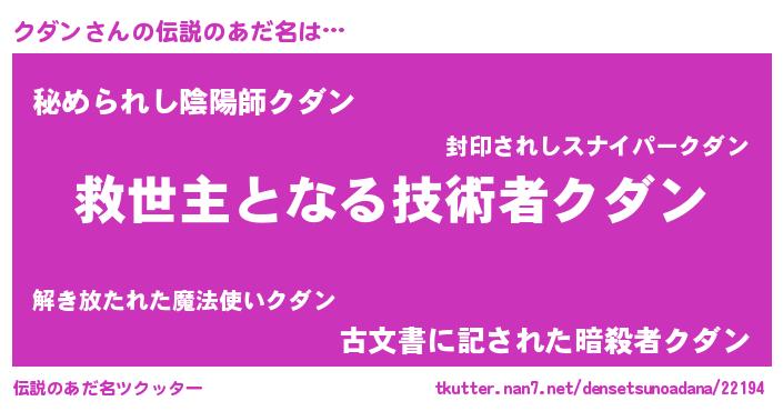 | 男性向けラノベタイトル風あだ名 | 『クダンに滅ぼされるだけの簡単なお仕事です』 |