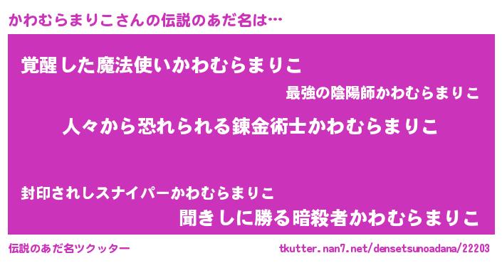 | 男性向けラノベタイトル風あだ名 | 『おまえをオタクにしてやるから、俺をかわむらまりこにしてくれ! 』 |