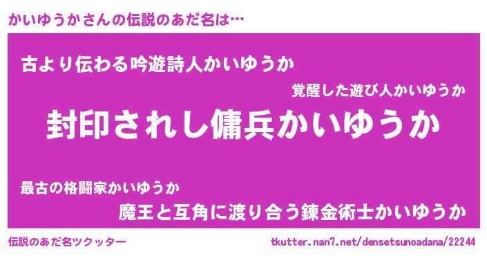 | 男性向けラノベタイトル風あだ名 | 『この素晴らしい世界にかいゆうかを!』 |
