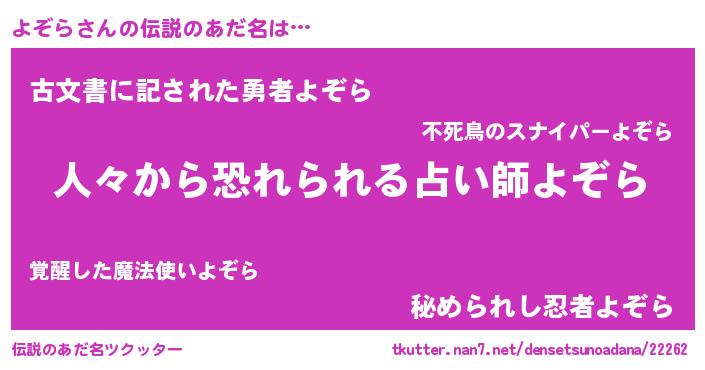 | ヘコむあだ名 | 『よぞら(笑)』『牛乳』『よぞにー』 |