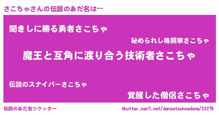 | 女子向けラノベタイトル風あだ名 | 『シンデレラさこちゃ家の靴箱館』 |