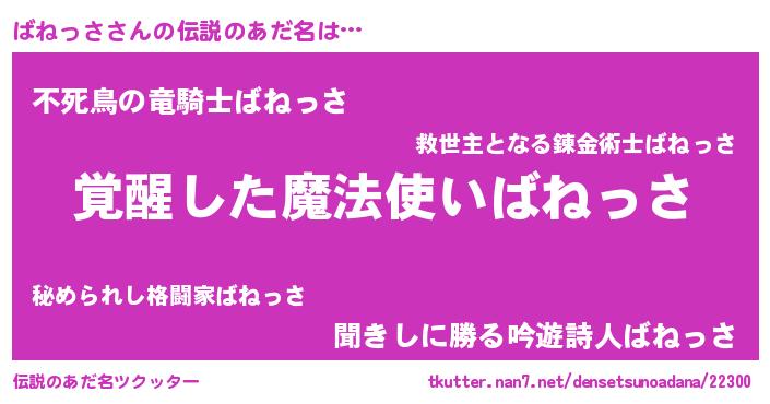 | 男性向けラノベタイトル風あだ名 | 『ばねっさの嫁は女の子じゃないと思った?』 |