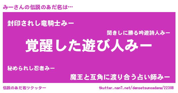 | 男性向けラノベタイトル風あだ名 | 『みーの嫁は女の子じゃないと思った?』 |
