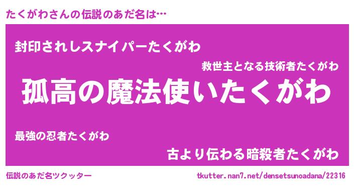 | ポケモン風あだ名 | 『ヒタクガワ』『タクキング』 |