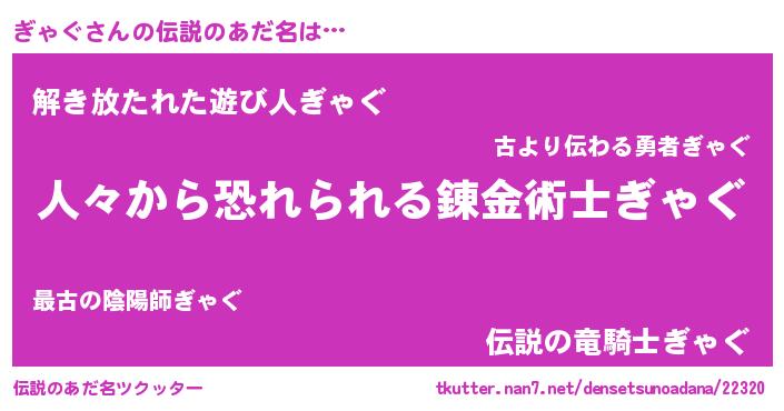 | 男性向けラノベタイトル風あだ名 | 『魔弾の王とぎゃぐ』『ぎゃぐの憂鬱』 |
