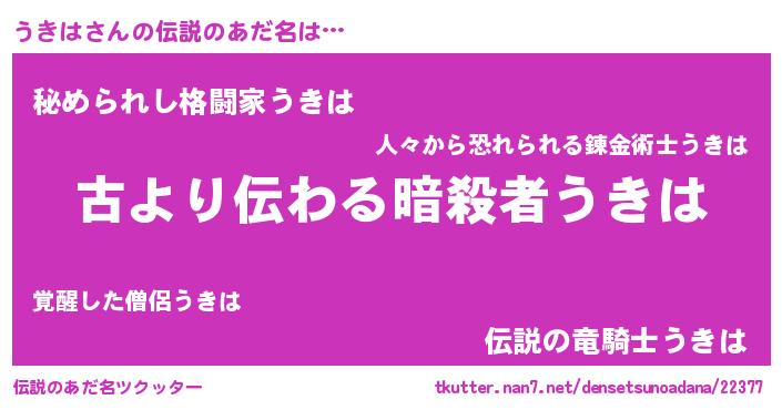 | 胡散臭い通販商品みたいなあだ名 | 『来世でも幸せになれる健康食品…その名も「うきは」』 |
