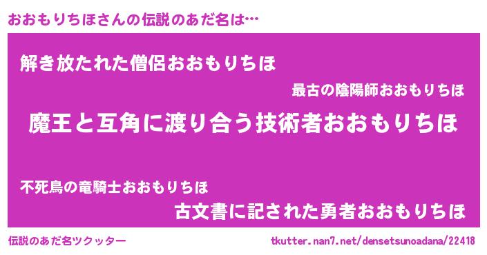 | ポケモン風あだ名 | 『オックウザ』『ヒオオモリチホ』 |