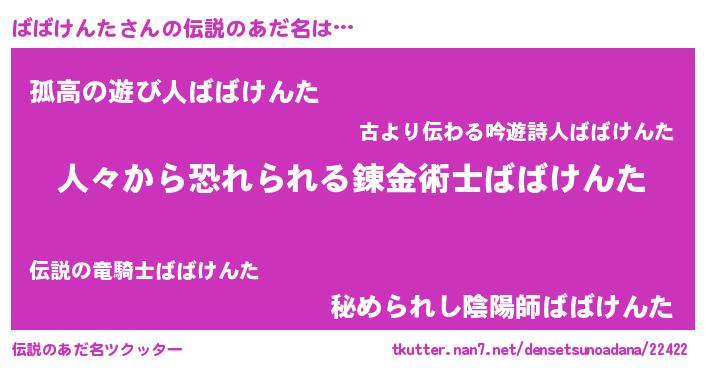 | 意味不明あだ名 | 『住所不定無職ばばけんた(95歳)』 |