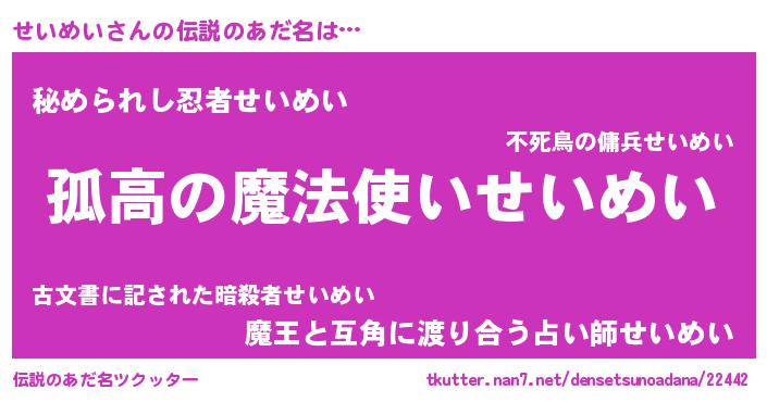 | 男性向けラノベタイトル風あだ名 | 『魔弾の王とせいめい』 |