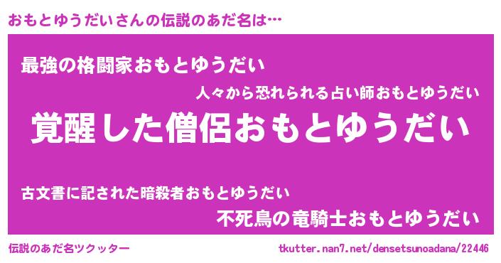 | 男性向けラノベタイトル風あだ名 | 『おもとゆうだい~年齢イコール彼女いない歴の魔法使い~』 |
