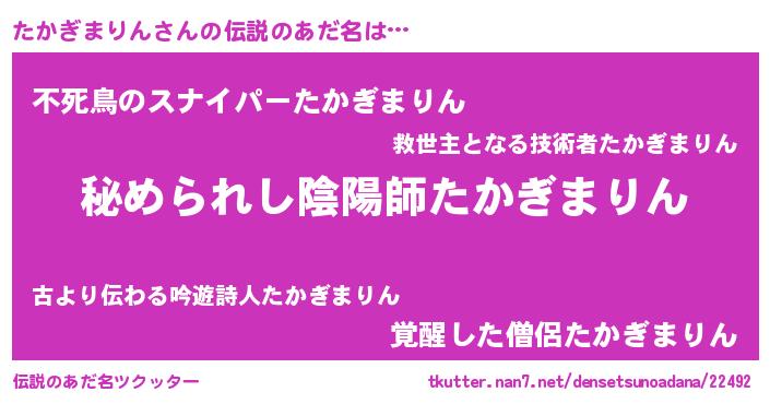 | 男性向けラノベタイトル風あだ名 | 『やはりたかぎまりんの青春ラブコメはまちがっている 』 |