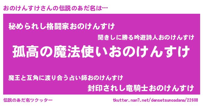 | 男性向けラノベタイトル風あだ名 | 『ダンジョンにおのけんすけを求めるのは間違っているだろうか』 |
